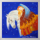 Un hermoso caballo blanco con un ángel dormido en la espalda. Los copos de nieve están cayendo lentamente desde el cielo nocturno.