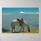 Un caballo grava cerca de la cima del volcán Pichincha, Ecuador. En el fondo se encuentra la ciudad de Quito y el volcán Cayambe, con sus nevadas, que forma parte de la "Avenida de los Volcanes" que atraviesa el país. Nuestra fotografía de viaje y nuestros diseños están disponibles como regalos para el hogar, tarjetas, rompecabezas, arte en la pared y más.