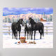 Una familia de caballos negros de cuarto en su corral de rancho invernal.