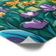 La escena representa a varios caballos salvajes pastoreando tranquilamente en un exuberante prado lleno de flores silvestres. Un sereno lago azul refleja las imponentes montañas nevadas y un cielo dramático. El artista ha utilizado una mezcla de tonos cálidos y fríos, desde los brillantes amarillos y verdes del primer plano hasta el fresco azul y púrpura de las montañas y el cielo lejanos, creando una sensación de armonía alegre.