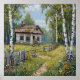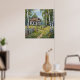 Una escena serena del campo que presenta una acogedora cabaña de madera rodeada de altos abedules y flores silvestres vibrantes. El encanto rústico evoca paz y una conexión con la belleza natural.