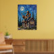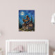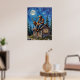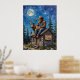 Esta imaginativa pintura retrata a Bigfoot, con un gorra y chaleco de vaquero, sentados en el techo de una acogedora cabaña de troncos por la noche. Está acunando una alce joven en sus brazos, mirando hacia una luna grande y luminosa. La cabaña está rodeada de altos pinos y el cielo nocturno es un índigo profundo lleno de estrellas. Un cartel de madera en la cabina muestra la frase humorística "Pie grande tampoco cree en ti". Las gruesas pinceladas texturadas contribuyen a la atmósfera caprichosa y un poco misteriosa de la escena.