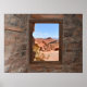 Vista interior de cabaña del Valle del Fuego mirando la arenisca azteca de color rojo brillante en el parque estatal. 100% Personalización. Haga clic en el botón PERSONALIZAR para agregar, mover, eliminar, cambiar el tamaño o cambiar cualquiera de los tipos de letra o gráficos.