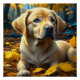 Cachorro jugando en un cartel de hojas amarillas de otoño.