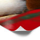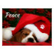 Una maravillosa imagen de un perro encorvado bajo un sombrero de Santa. Texto de paz en blanco.
