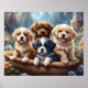 Este poster presenta adorables cachorros en una canasta sobre un prado floral. ¡El motivo perfecto para todos los amantes del perro y los niños! Bonita decoración de habitaciones para niños.