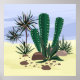 Cacti, suculentos en la arena desértica, rocas contra el cielo azul.