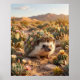 An adorable cactus hedgehog rests in a warm desert garden filled with blooming succulents and golden light. Its rounded hedgehog body is covered in soft cactus spines, layered green textures, tiny flowers, and charming botanical details while keeping a sweet expressive face and tiny paws. Warm sand, polished stones, distant dunes, and evening sunshine create a cozy desert mood. This playful yet refined design adds joy and character to nurseries, kitchens, boho spaces, or gift collections. Perfect for hedgehog fans, plant lovers, and cute nature-inspired decor.