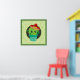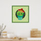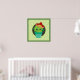 Un poster con un lindo ilustracion de un cactus verde sentado en una maceta de flores. Grandes ojos kawaii y con sombrero rojo. El fondo es un patrón con movimientos verdes de cal.