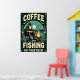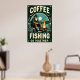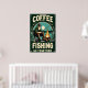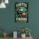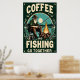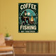 Un ilustracion de estilo retro con un pescador sentado junto a una fogata con una barra de pesca y una taza de café, con el texto Café & Pesshing Go Together en el que destaca el lugar.