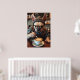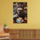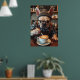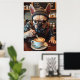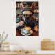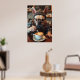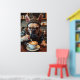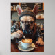 Empieza tu día con una risa —este poster exhibe un Bulldog francés en forma humana, vestido con una camisa verde y blanca, suspensores y gafas gruesas. Está a mitad de café con leche detrás de una moderna cafetería, mostrando un serio enfoque barista. Su expresión dice que ya ha tomado tres tomas de "Bark Roast". Los nombres de las bebidas de los pizarrones son tontos y completan la escena. Una elección perfecta para las cocinas, cafés o cualquier persona que ame los perros, el café y el arte extravagante de las paredes.