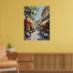 Este cuadro representa una animada escena callejera europea, con cafés y comensales derramándose sobre la calle adoquinada. El arte tiene un estilo vibrante y texturizado, con pinceles visibles que crean un sentido de energía y movimiento. La gente se sienta en las mesas bajo toldos rojos y beige, mientras que otros se pasean por la calle. Los altos edificios con balcones y el ambiente soleado le dan al lugar un encanto clásico y bullicioso europeo.