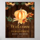 Letrero de bienvenida para baby shower de pequeña calabaza naranja en acuarela. Con una calabaza en acuarela descansando sobre una cama de hojas de colores otoñales y fuente de "Bienvenidos" con brillo dorado. Personaliza este hermoso cartel de bienvenida de la pequeña calabaza de manera fácil y rápida.
