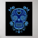 Este impresionante diseño presenta un cráneo de azúcar del Día de los Muertos con un fondo negro puro. Cuatro rosas rodean el cráneo con delicadas viñas que llegan hasta una estrella de cinco puntos en la base del patrón. Un gran corazón se sienta en el centro de la frente con movimientos fluidos a ambos lados. Este hermoso diseño es un elegante ejemplo de este símbolo del Día de los Muertos.