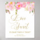 Letrero de "El amor es dulce, por favor toma un regalo" con diseño floral rosa y dorado y hermosa caligrafía. Este diseño femenino de acuarela tiene flores rosas y doradas con un toque de verde. Cuenta con elegante letra a mano y tipografía en dorado, con "El amor es dulce" escrito a mano en caligrafía circular. Por favor, explore mi tienda para encontrar artículos que coincidan.