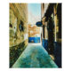 Una animada callejuela con paredes de colores y un paseo de azulejos azules bajo la luz del sol. La escena refleja un ambiente artístico y tranquilo típico de los pueblos históricos.