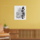 Arte caligráfico de Takeda Shingen (武 田 玄), debajo del kanji está la firma samurai de Shingen y el kamon del clan Takeda bishi. Al fondo está la estatua de Takeda Shingen en las afueras de la estación de Kofu en Japón.