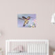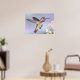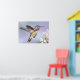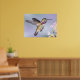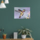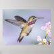 Poster rosa y morado con un hermoso colibrí caliope volando sobre flores de lantana amarillas y rosas, mostrando sus alas completamente estiradas en la espalda y sus plumas de garganta magenta iridiscentes. Bonita y única decoración mural para los amantes del colibrí, el jardín y la naturaleza. Divertido hecho: este colibrí es el ave más pequeña de Norteamérica y lleva el nombre de la musa Calliope en la mitología griega. Fotografía tomada en Pasadena, California.