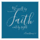 Este hermoso arte mural presenta la inspiradora cita "Caminamos por la fe, no por la vista" (2 Corinthians 5:7), ofreciendo un recordatorio para confiar en lo invisible y caminar con confianza. Perfecto para cualquier habitación en su casa u oficina, esta pieza le aportará energía positiva y aliento espiritual a su espacio. Ya sea que se exhiba en su sala de estar, dormitorio o estudio, es un hermoso recordatorio del poder de la fe. Disponible en diferentes tamaños para adaptarse a tu estilo y decoración.