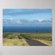 Una carretera de tierra montañosa que conduce a la hermosa costa azul de Hawaii, hierba a ambos lados y bocanadas de nubes en el cielo azul. Tomada en la Gran Isla de Hawaii.