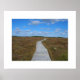 La pasarela a través de un tramo de páramos en el Seaside Adjunct del Parque Nacional Kejimkujik. Esta tierra plana bajo un brillante cielo azul es hogar de hermosas flores silvestres y plantas carnívoras. Aquí en otoño, puedes ver muchas de estas plantas volverse de un rojo brillante.