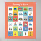 Póster colorido y lindo con todos los camiones y transportes que a los niños pequeños les encanta jugar y soñar con montar ellos mismos. La tipografía de fuente moderna "Habitación de Jeremy" se puede personalizar a través del menú de edición. Gran arte para la pared del dormitorio o sala de juegos de los niños - o como regalo para baby shower o cumpleaños.