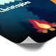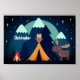 Este poster de Camping cuenta con una tienda, una fogata, una lechuza y un alce bajo un cielo alto con luna llena y montañas al fondo.