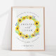 Bienvenido a su boda con nuestro elegante y rústico poster Flowerfields, que cuenta con una corona de girasoles color agua amarillo, follaje verde y pequeños brotes de flores silvestres azul marino. Agregue sus nombres, fecha de boda y texto de bienvenida personalizado usando los campos proporcionados.