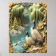 Dos majestuosos gansos canadienses ocupan un lugar destacado en una tranquila orilla del río, rodeados por una tranquila procesión de exuberantes y llorosos sauces que se extienden con elegancia sobre las tranquilas aguas donde los patios se reman suavemente. Las flores doradas florecen sobre marcos ornamentales, añadiendo un toque de brillo a la escena crepústica.