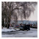 Escena fotográfica de invierno nevada con barcos estrechos en el congelado canal.