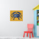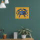 El grabado de madera de cangrejo azul, en azul sobre un fondo amarillo.