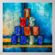 Pirámide de diez latas vacías de sopa de colores blanco, azul y rojo contra la pared metalizado de grunge. Algunas latas son rodadas. Poster para decorar una casa u oficina para cualquiera.