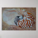 Obra artística original de tempura de huevo de Aileen Rolfe en marrón, naranja, blanco y negro de una concha de nautilus tendida en su lado con las distintivas marcas de rayas de cebra visibles.
