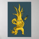 Poster arbórea espeluznante con un carácter extraño que se asemeja a un árbol amarillo con ramas onduladas en forma de piernas y manos entrelazadas unas con otras sobre fondo gris oscuro. Este personaje espeluznante te mira con los ojos con pupilas, listo para Halloween.