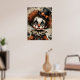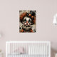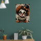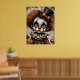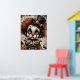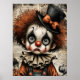 Carnaval desgarrado - El Poster melancólico de la mascarada Un niño payaso afligido mira fijamente a través de ojos huecos, su cara pálida pintada con un maquillaje negro dramático y una expresión fracturada. El cabello frito de auburn se derrama por debajo de un sombrero negro de techo adornado con una proa naranja, mientras un collar escarpado enmarca un vintage disfraz en tonos desvanecidos de naranja y azul. Alrededor de la figura hay calabazas fantasmales y fragmentos de texto envejecido, que evocan una permeable nostalgia. La composición huele con profundidad emocional y elegancia inquietante —donde el capricho se encuentra con el cansancio, y cada rayo cuenta una historia.