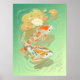 Poster con dos koi de carpa en ilustracion de estanque de nenúfares. Colores verdes, amarillos, naranjas y dorados.
