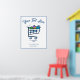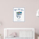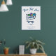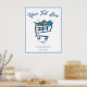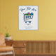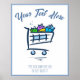 Compras / carrito / carro / vagón / aventura con alegres mochilas sonrientes / regalos. Ilustracion de mano. Plantilla de personalizable, poster de promoción. Tema azul. — Temas relacionados: E-Commerce / tienda en línea, venta en invierno, centro comercial / mercado, parque minorista, dueño de tienda, tendero.