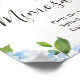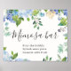 Bienvenidos a su boda con Cartel de barra de Mimosa con Hortensias Azules Floral Chic, con exuberante vegetación botánica de acuarela y flores blancas, con "bienvenidos a nuestro feliz para siempre", sus nombres y fecha de la boda en una mezcla chic de tipos de letra modernos y caligráficos a mano.