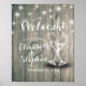 Plantillas de cartel de bienvenida de boda - Letra elegante, Copas de champán vintage y luces de cuerda en fondo de madera rústica.