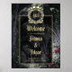 Este cartel de bienvenida de boda gótica en negro y dorado, que presenta una escena floral de rosas en ruinas góticas, se puede personalizar con las iniciales de su monograma e información del evento en tipografía elegante. Diseñado por Thisisnotme©