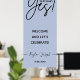 Simple letrero de fiesta de compromiso con letra '¡Ella dijo Sí!'. Diferentes opciones de color de fondo disponibles: rosa suave, salvia, rosa polvoriento, azul polvoriento. Los nombres y la fecha del evento son editables.