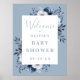 Esta elegante cartel de bienvenida para baby shower con tema floral country en azul polvoriento se puede personalizar con su información en tipografía moderna. Diseñado por Thisisnotme©