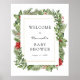 Bienvenidos a su baby shower con este hermoso cartel que presenta un marco dorado rodeado de hojas perennes de invierno, poinsettias, bayas de acebo y vegetación. Agregue el nombre de la invitada de honor, la fecha de la ducha y el texto de bienvenida personalizado utilizando los campos proporcionados.