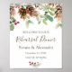 Elegante cartel de bienvenida para cena de ensayo con verde invernal. Este diseño presenta una ilustración de ramas de pino y conos con bayas rojas en estilo acuarela sobre fondo blanco.