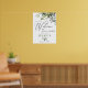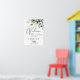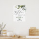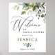 Bienvenidos a su boda con el cartel de bienvenida para despedida de soltera con flores de rosas blancas y vegetación floral, con vegetación botánica de acuarela y flores blancas, con "bienvenidos a nuestro felicidad para siempre", sus nombres y fecha de boda en una mezcla elegante de tipos de letra modernos y caligrafía manuscrita.