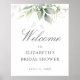 Hermoso cartel de bienvenida para despedida de soltera con eucalipto en acuarela y hojas doradas.