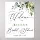 Bienvenidos invitados a su boda con Póster de bienvenida para despedida de soltera con rosas blancas y vegetación floral, con vegetación botánica de acuarela exuberante y flores blancas, con "bienvenidos a nuestro felicidad para siempre", sus nombres y fecha de la boda en una mezcla elegante de tipos de letra modernos y caligráficos a mano.