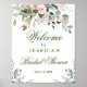 Bienvenidos a su boda con el cartel de bienvenida para despedida de soltera con flores blancas y vegetación floral, que incluye vegetación botánica de acuarela exuberante y flores blancas, con "bienvenidos a nuestro para siempre feliz", sus nombres y fecha de boda en una mezcla elegante de tipos de letra modernos y caligráficos a mano.