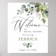 Bienvenidos invitados a su boda con Póster de bienvenida para despedida de soltera con flores de rosas blancas y vegetación floral, con vegetación botánica de acuarela exuberante y flores blancas, con "bienvenidos a nuestro felicidad para siempre", sus nombres y fecha de la boda en una mezcla elegante de tipos de letra modernos de bloque y caligrafía manuscrita.