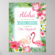 El cartel / póster de bienvenida para la despedida de soltera presenta dos hermosos flamencos rosados con un exuberante marco de hojas de palma verdes y flores de hibisco tropicales en tonos de rosa intenso, amarillo soleado y blanco. El texto elegante de Aloha con título en pancarta azul acuático se puede personalizar completamente para su evento y el nombre de la futura novia. El color de fondo es azul / verde de espuma de mar.